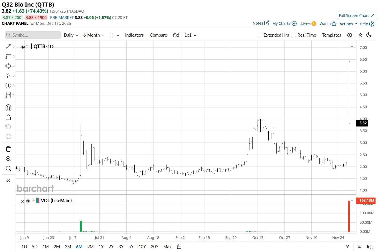 Q32 Bio (QTTB) shares more than doubled on Dec. 1 after the biotechnology company announced a strategic deal with the Cambridge-headquartered Akebia Therapeutics (AKBA).