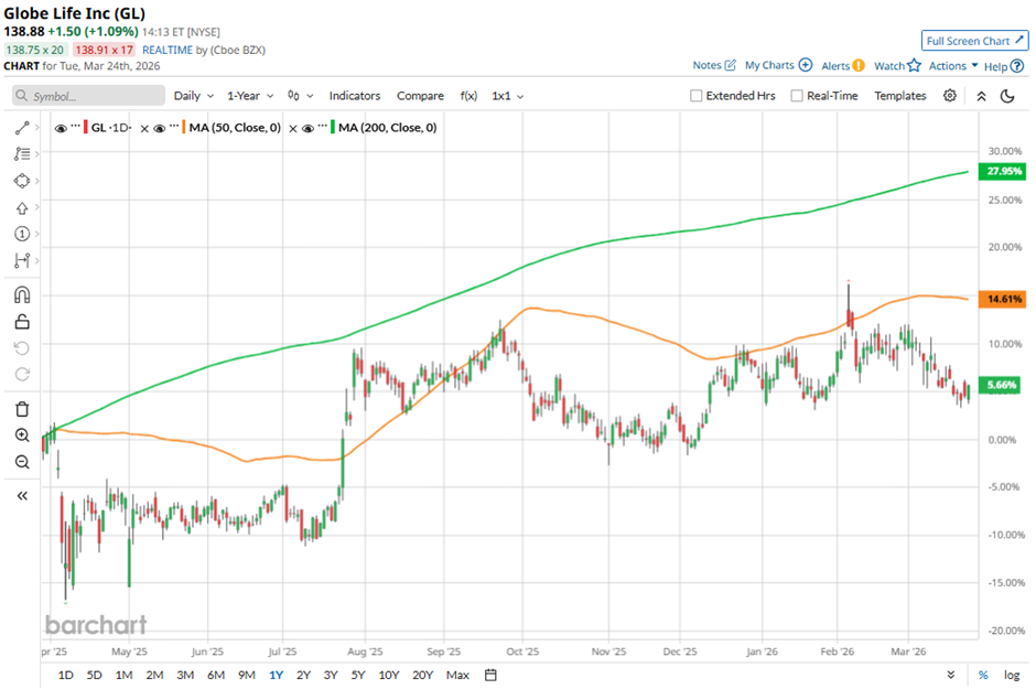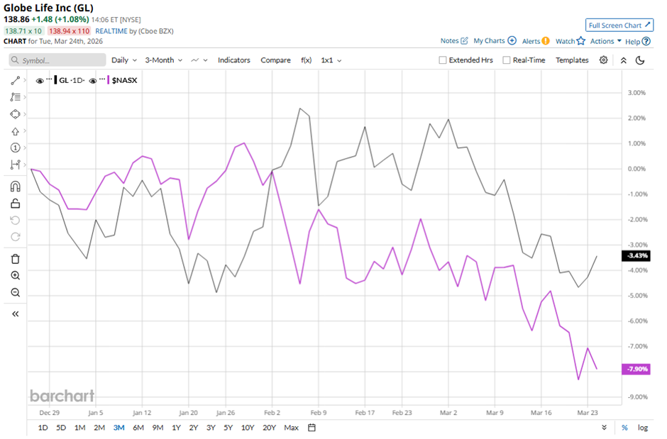 Shares of the McKinney, Texas-based company have pulled back 9.1% from its 52-week high of $152.71. GL stock has decreased 3.2% over the past three months, a less pronounced decline than the Nasdaq Composite’s ($NASX) 7.9% drop over the same time frame.