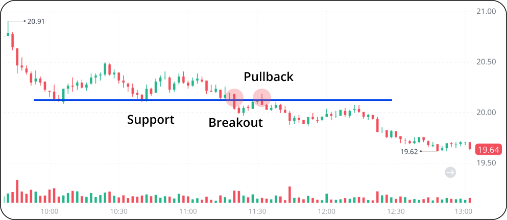 案例:當投資者不確定股價是真突破還是假突破時,可以等待價格回調。如果之前的支持位反轉成阻力位,那麼可以判斷此次為真突破的概率較高。