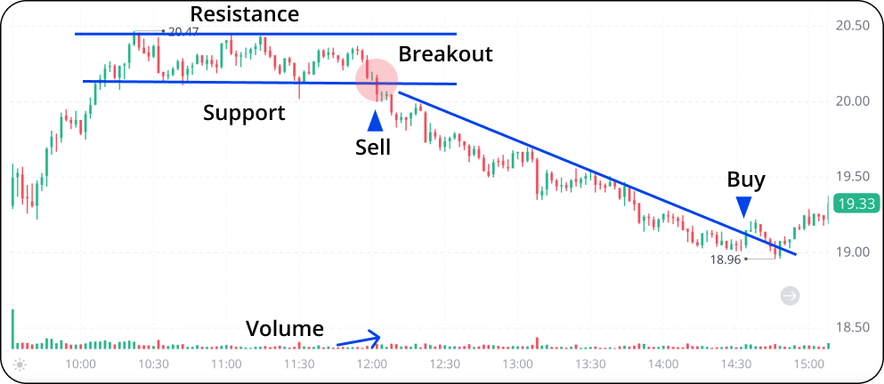 當股票/ETF升越過阻力位上方,又或跌破支持位,且伴隨交易量顯著增加,此時股價可能突破橫盤,產生新的價格趨勢。因此,識別突破的最基本方法是結合成交量,觀察股價在支持位/阻力位的活動情況。