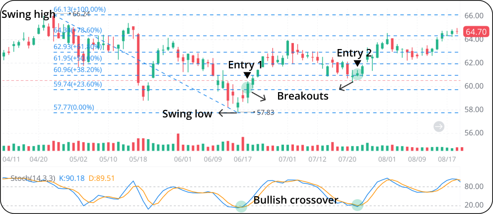 如下圖所示,當隨機指標(即stochastic oscillator)出現看漲交叉(bullish crossover),且價格升過 23.6% 的斐波那契回調線時,投資者可能在買點 1 買入股票。如果後續又出現第二個看漲交叉,且價格升過38.2% 的斐波那契回調線時,會形成買點2。