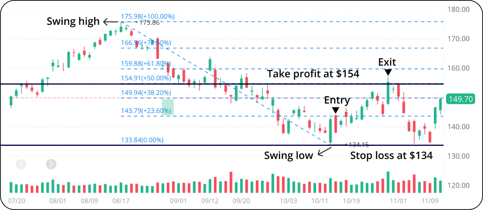 假設投資者在股價反彈後即刻買入進場,將止損價設為股價的低點,即$ 134的位置。同時,他們可能會在 $154(50%的斐波那契水平線)設置止賺價格,鎖定利潤。下圖可發現,價格反彈後,一路上行突破23.6%和38.2%的的斐波那契水平線,最終在突破50%的後快速回落。