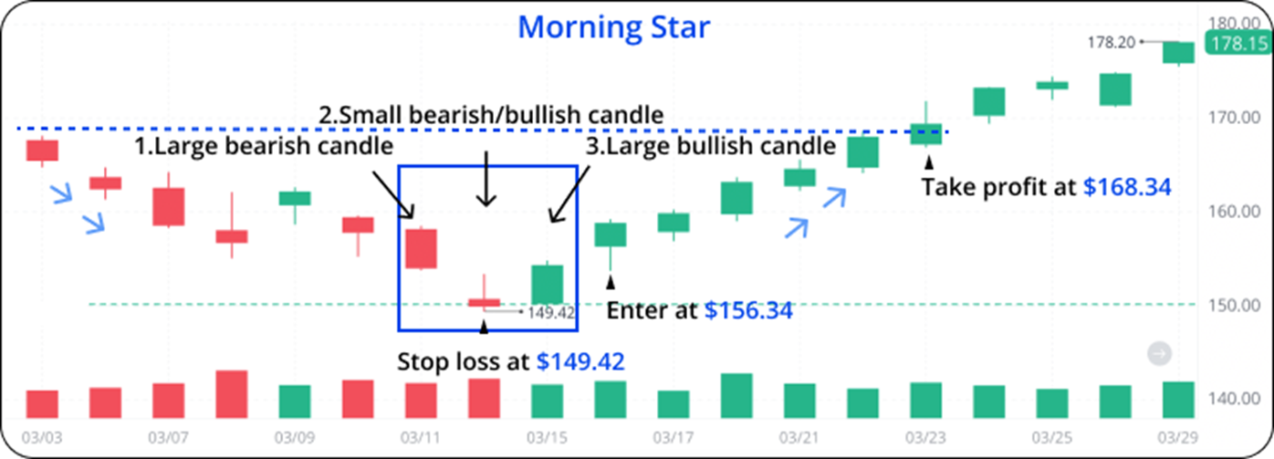 • 止損:投資者可以將止損價設置在早晨之星的第二根K線下方位置,在這種情況下,止損價設置為 $149.42。