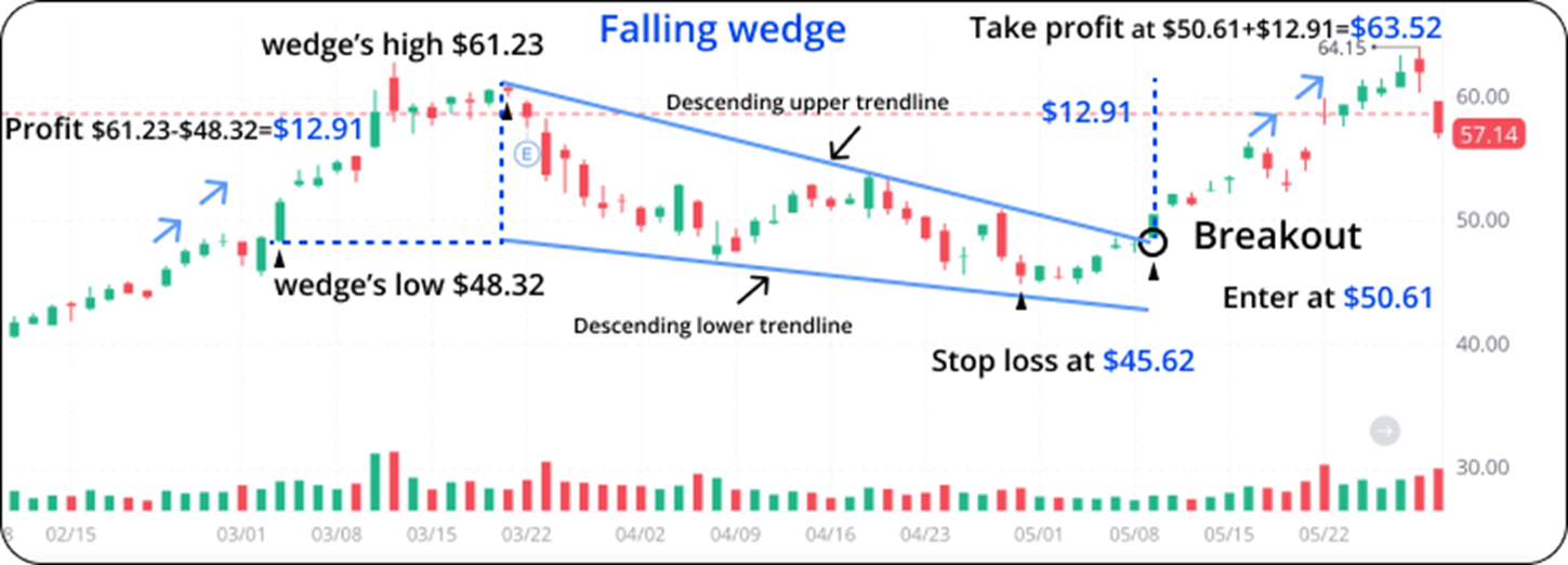 • 止賺:可將止賺價格設置為楔形高度加上突破價。比如,楔形的高度為 $12.91 美元(61.23 - 48.32),那麼投資者可以將止賺價格設置為 $63.52(12.91 + 50.61)。