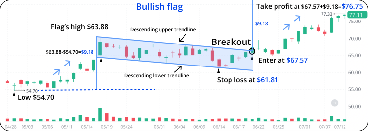 看漲旗型形態由兩條平行的下降趨勢線組成,使股票橫盤期看起來像一個旗幟。這個圖形通常被解釋為:當價格在短期內經歷了一次快速上漲(即旗杆)後,會進入了一個緩慢、平穩的調整期(即旗幟),隨後再次開始上漲。