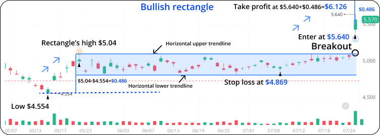 看漲矩形圖案通常出現價格上升的過程中,是由一條水平的阻力線和一條水平的支持線組成的,形狀類似於矩形。
