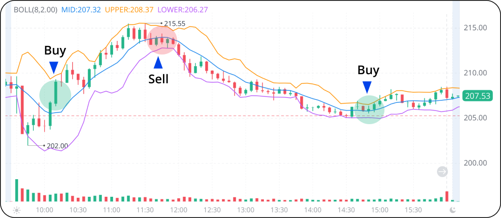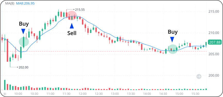 上圖使用5分鐘K線圖和8日均線來判斷股價的走勢。