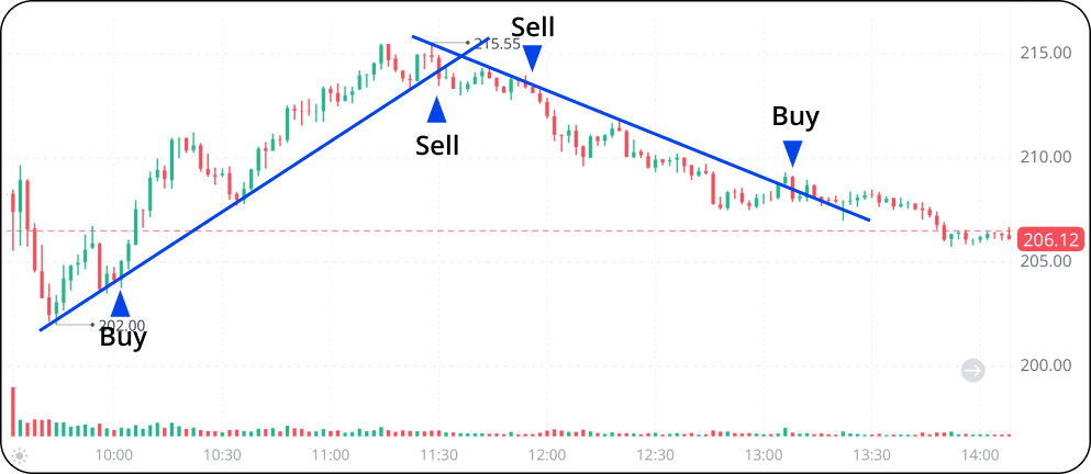 案例:上圖展示了2 分鐘K線圖,交易者可能在上升趨勢穩定時買入,一旦價格收於趨勢線下方,就會選擇平倉。同樣,當下降趨勢確定時,他們可能會賣空,一旦價格收於趨勢線上方就會平倉。