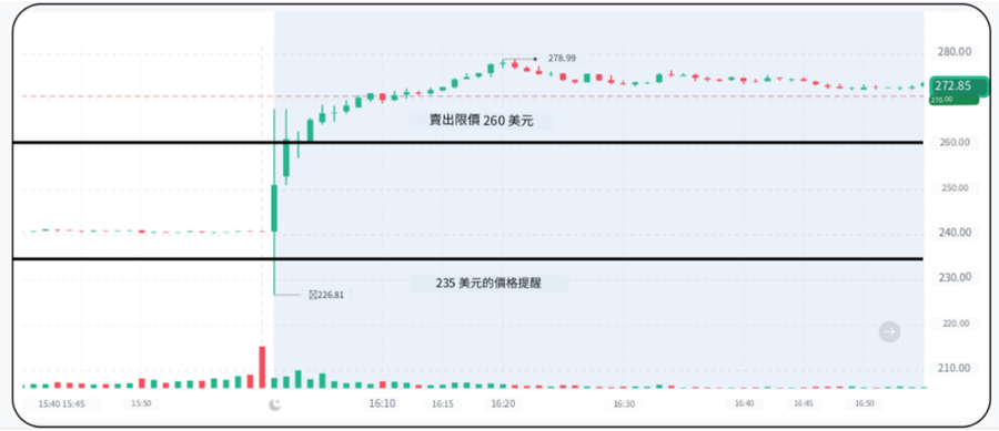 假設您預計股票 A 將在公告發布後超過預期,並跳升至 260 美元。您可預先以每股 240 美元的價格購買了 10 股股票,並下達以 260 美元的價格賣出這些股票的限價訂單。由於限價訂單無法保護您免受損失,因此您可以設置價格警報。如果價格反而下跌 5 美元,您將立即收到提醒。