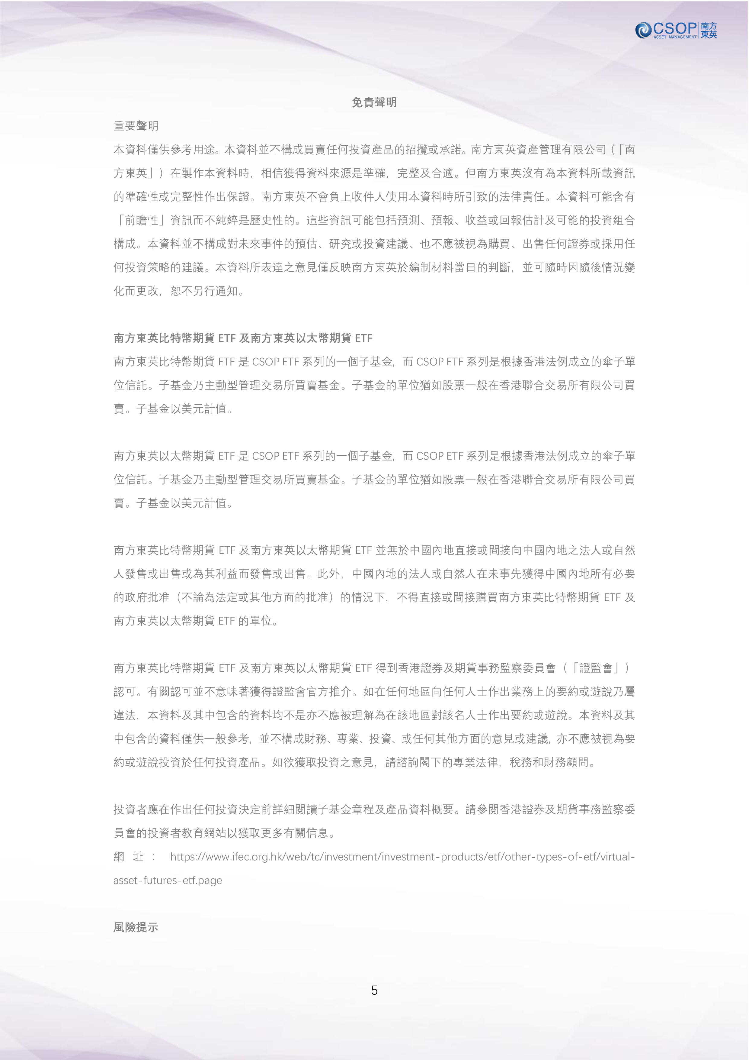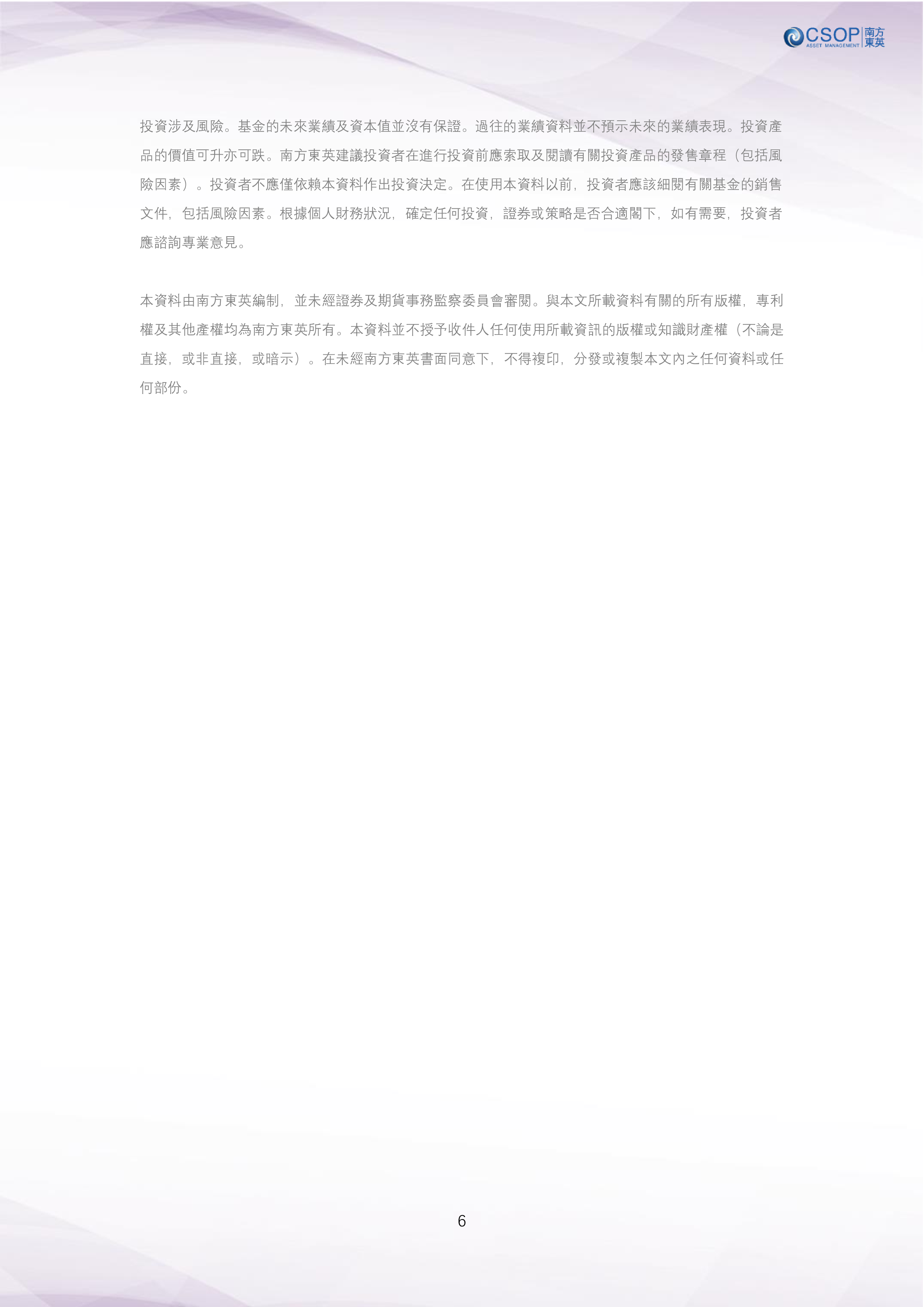 風險披露:本頁內容並非投資意見,亦不構成任何投資產品之要約、招攬或建議。本資料只作為一般用途,它並沒有考慮您的個人需要、投資目標及特定財政狀況。 所有的證券投資都會面臨風險,證券和任何金融產品的過往業績不能保證未來的回報。投資組合的多樣化配置可能幫助分散風險,但並不能確保收益或防止發生損失。在進行投資活動前,投資者應充分瞭解相關金融產品,明確知曉其潛在風險,依據自身的風險承受能力或專業投資顧問的建議理性決策。請參閱