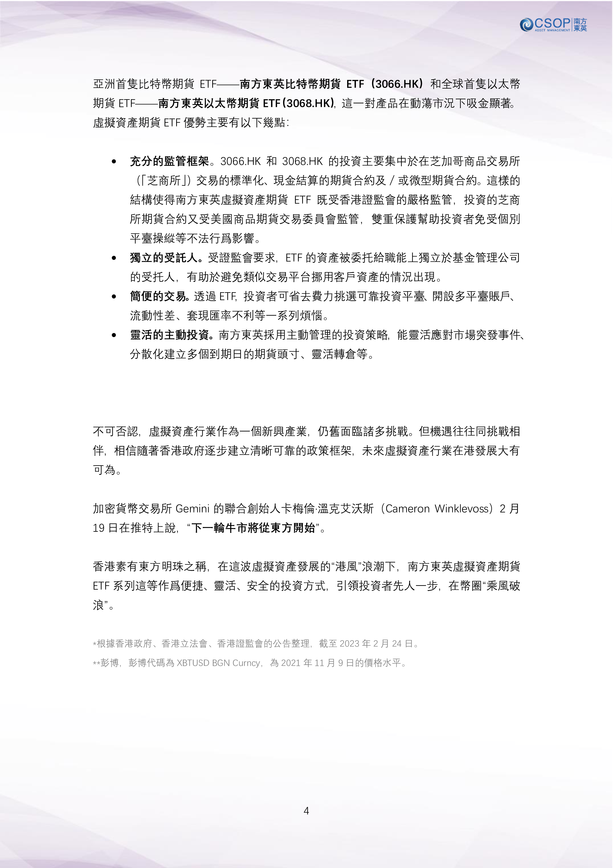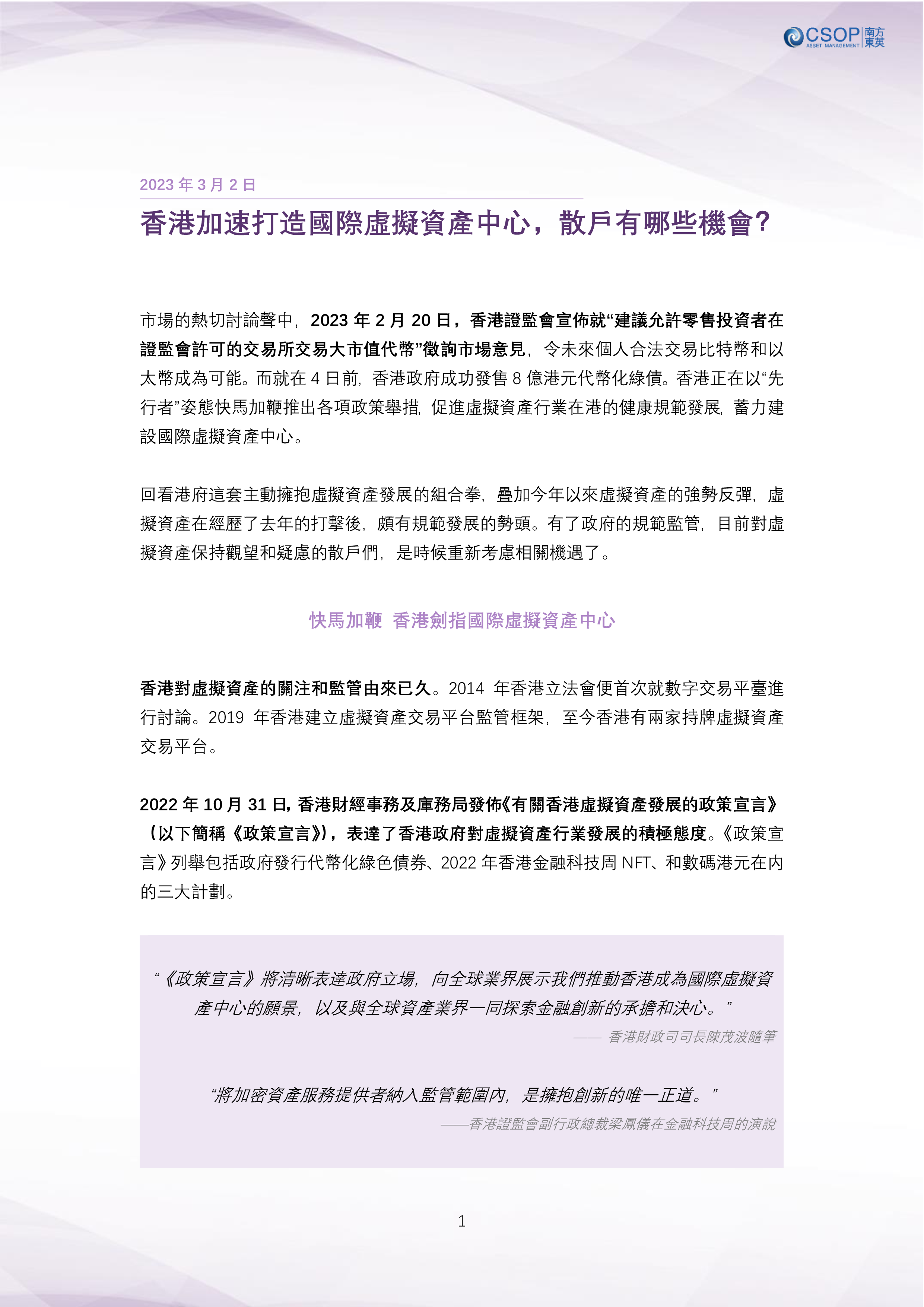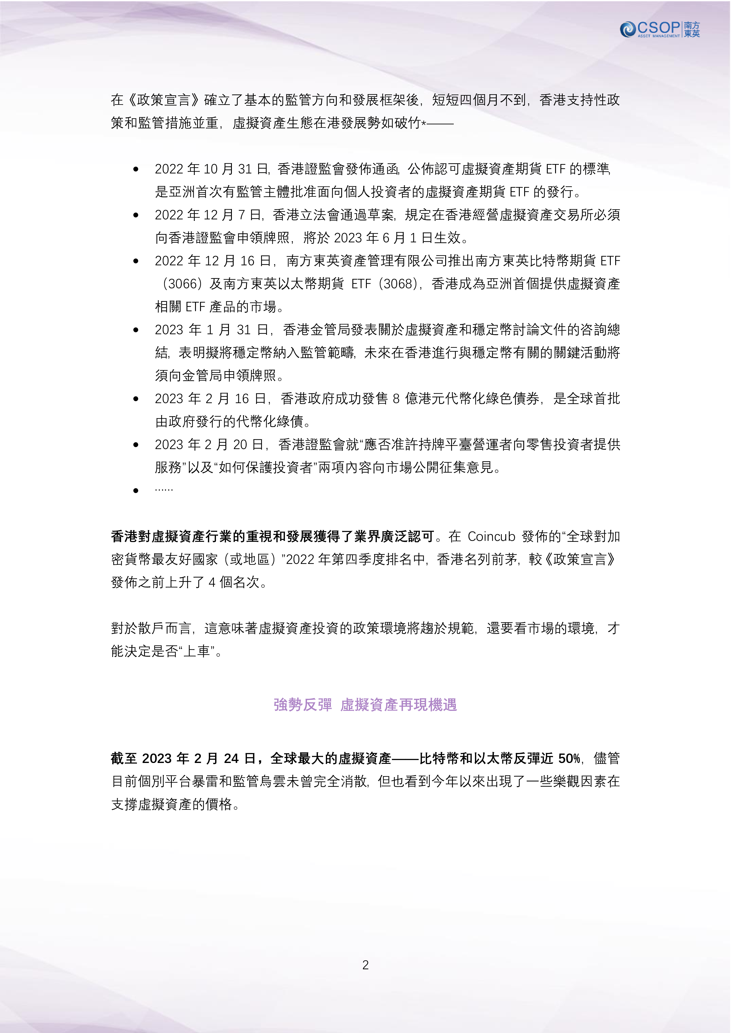 市場的熱切討論聲中,2023年2月20日,香港證監會宣佈就“建議允許零售投資者在證監會許可的交易所交易大市值代幣”徵詢市場意見,令未來個人合法交易比特幣和以太幣成為可能。而就在4日前,香港政府成功發售8億港元代幣化綠債。香港正在以“先行者”姿態快馬加鞭推出各項政策舉措,促進虛擬資產行業在港的健康規範發展,蓄力建設國際虛擬資產中心。